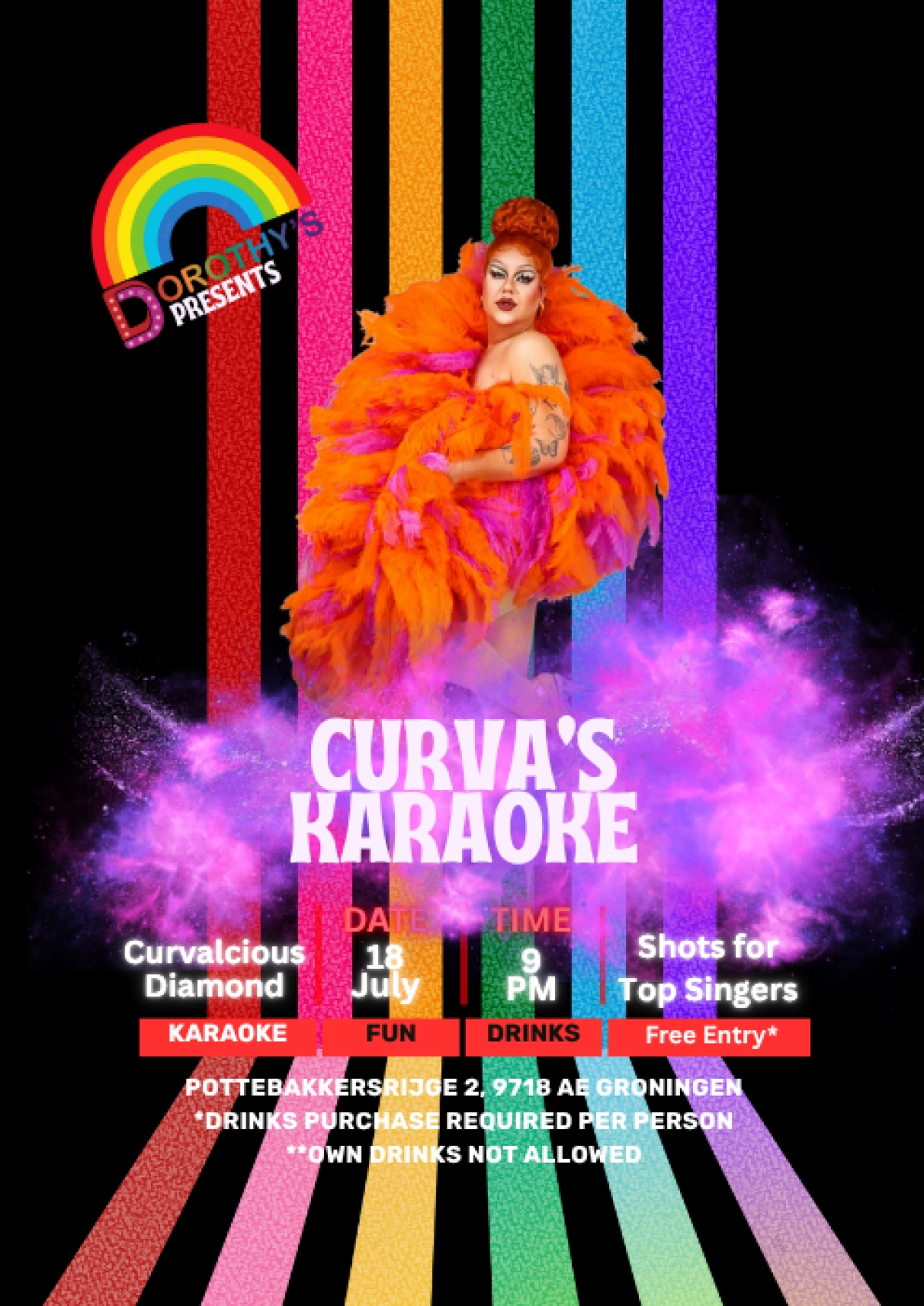 There has been a gay bar in this location for a long time, but since 2022, it has been taken over by Wayne and Andy under its current name. They have transformed it into the LGBTQI+++ and drag show bar of the north of the Netherlands. Weekly events include Drag Night, Bingo, and Karaoke evenings. Naturally, there is partying until late on Fridays and Saturdays.
